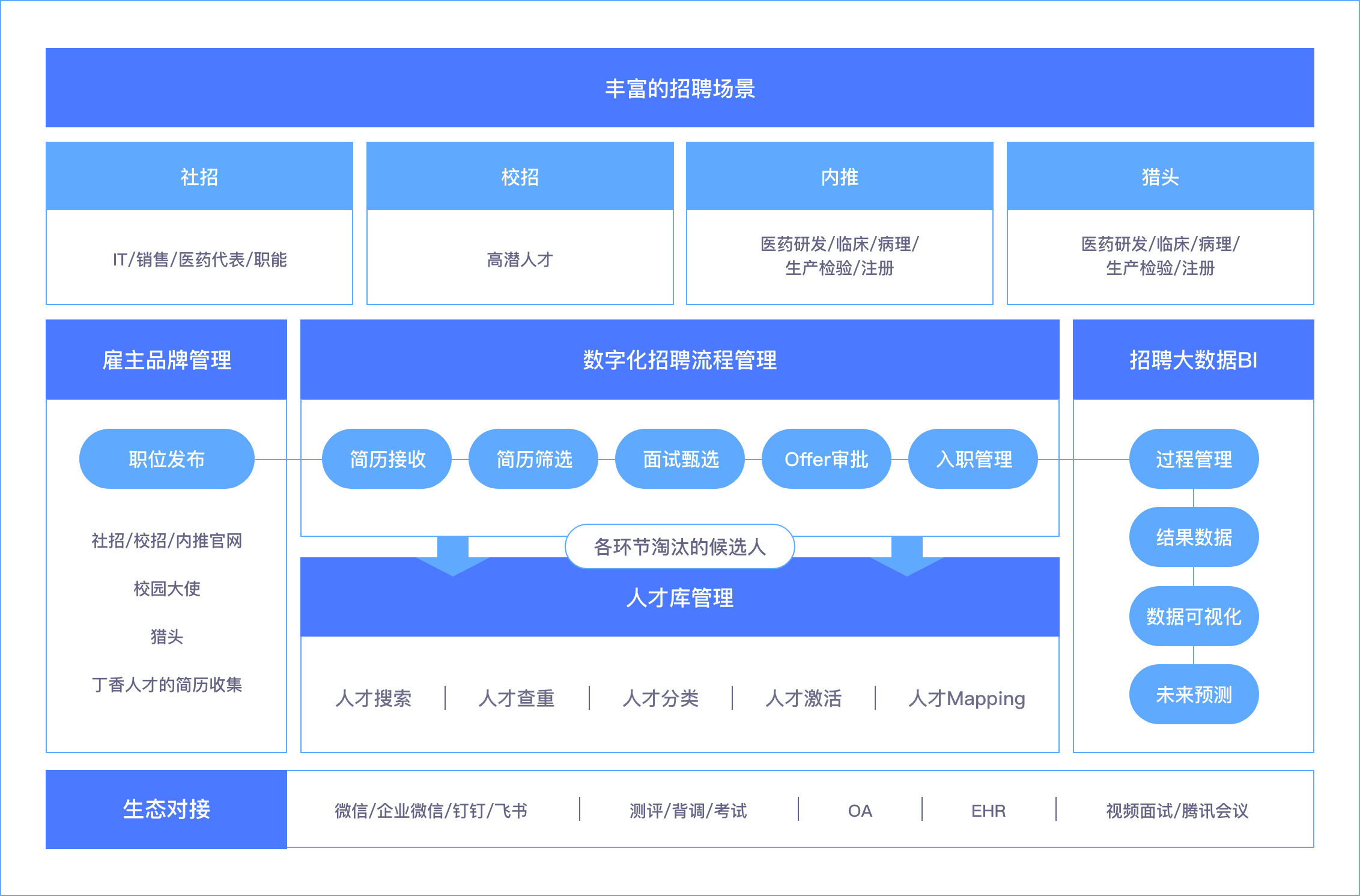 - 痛点营销人才需求量大行业发展快,招聘量大,医药代表、销售等营销人才流动性大,对招聘效率要求高。